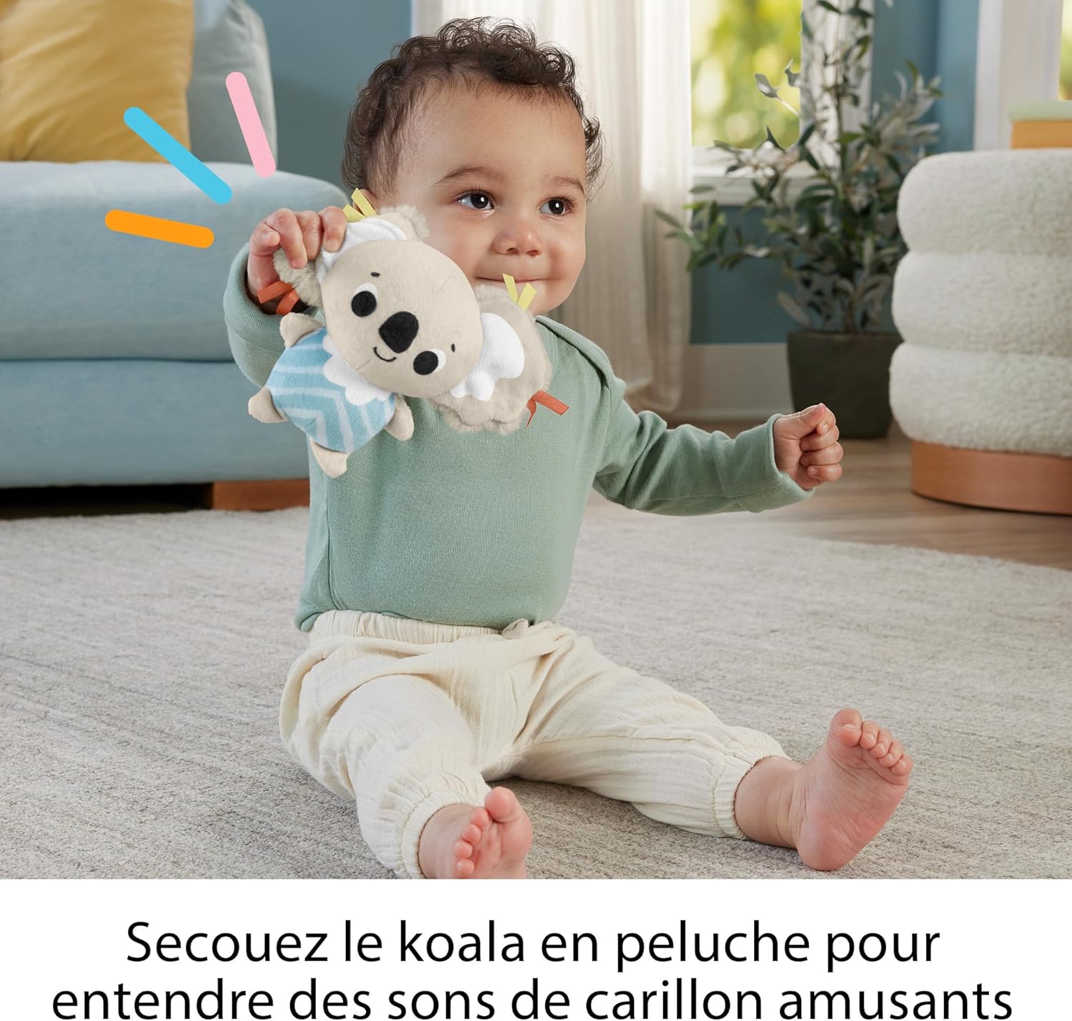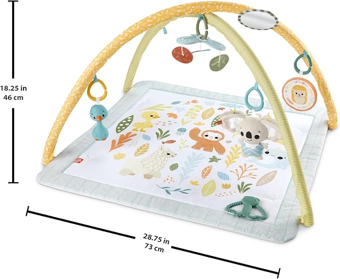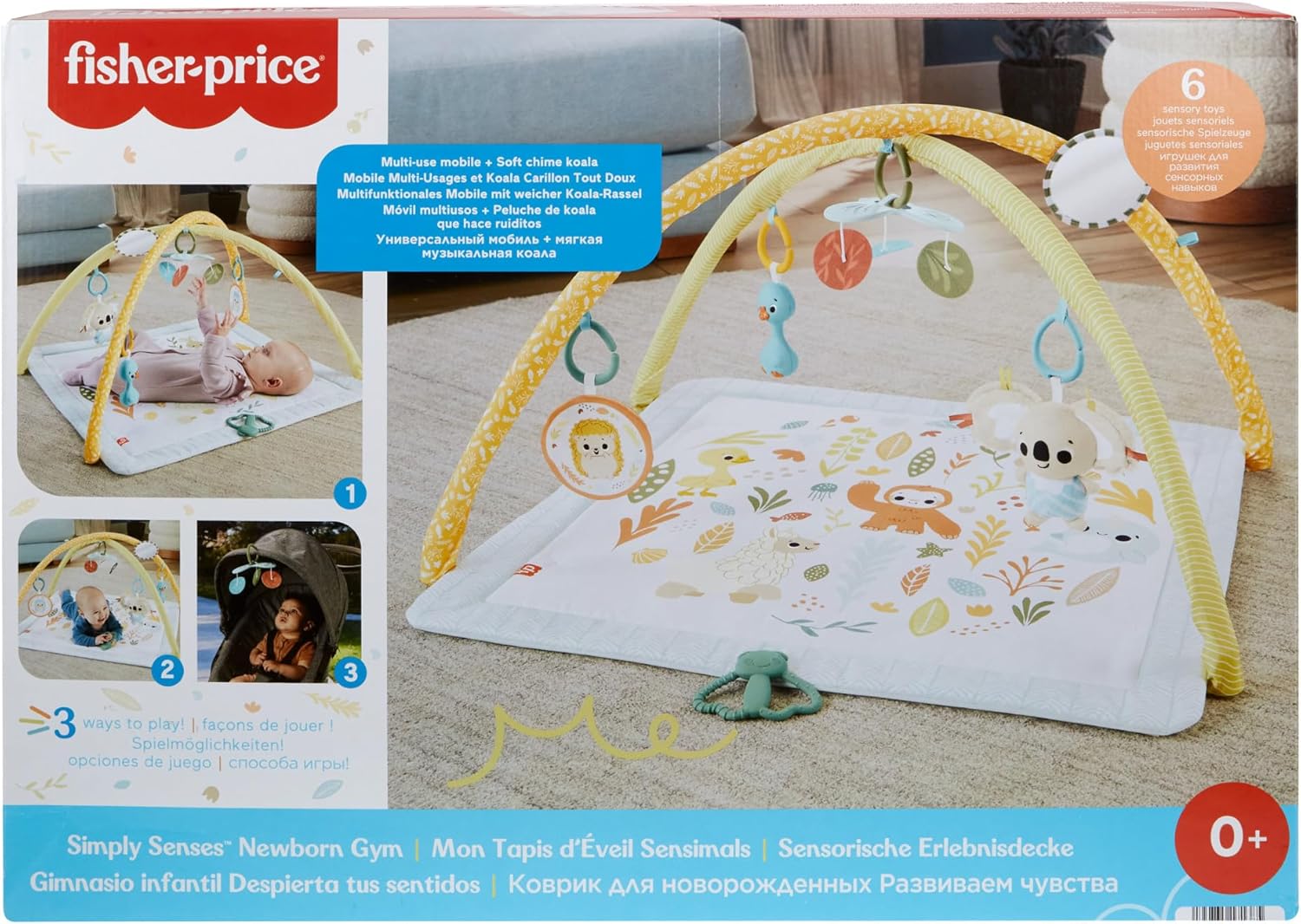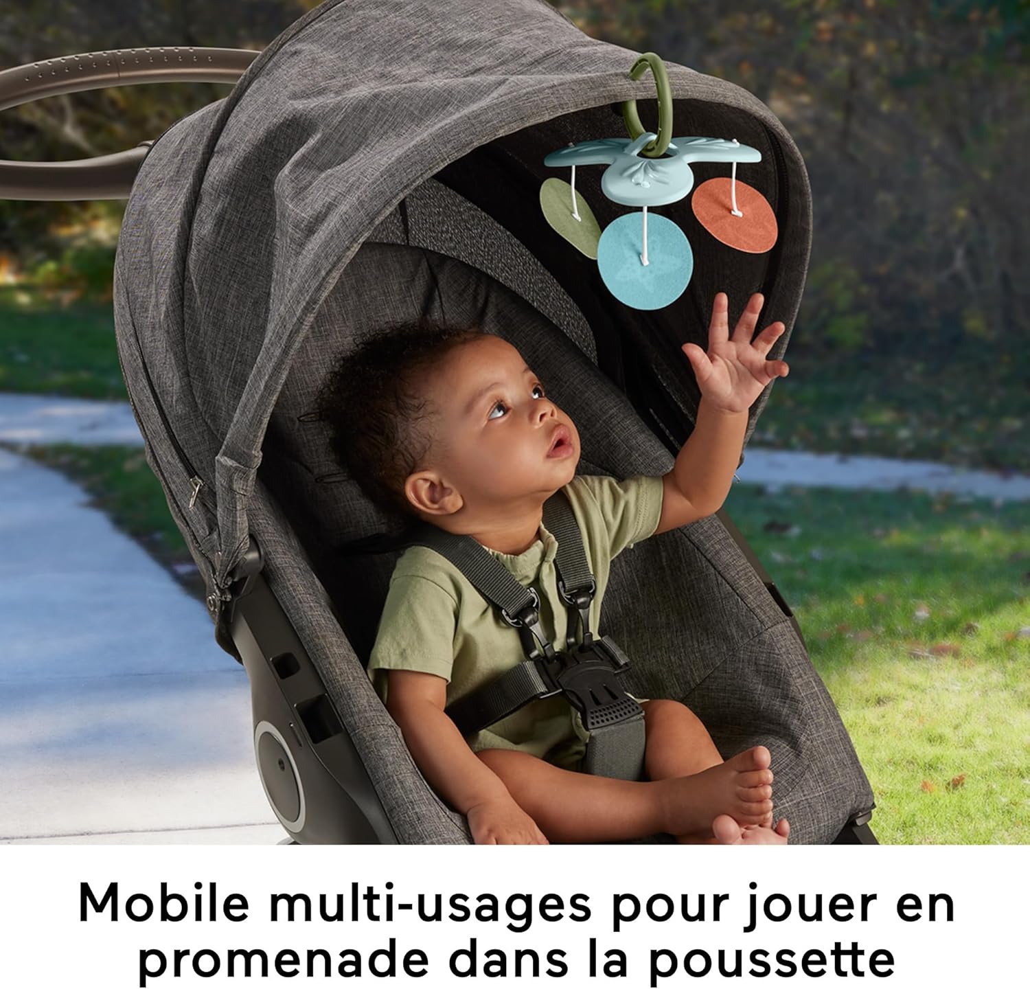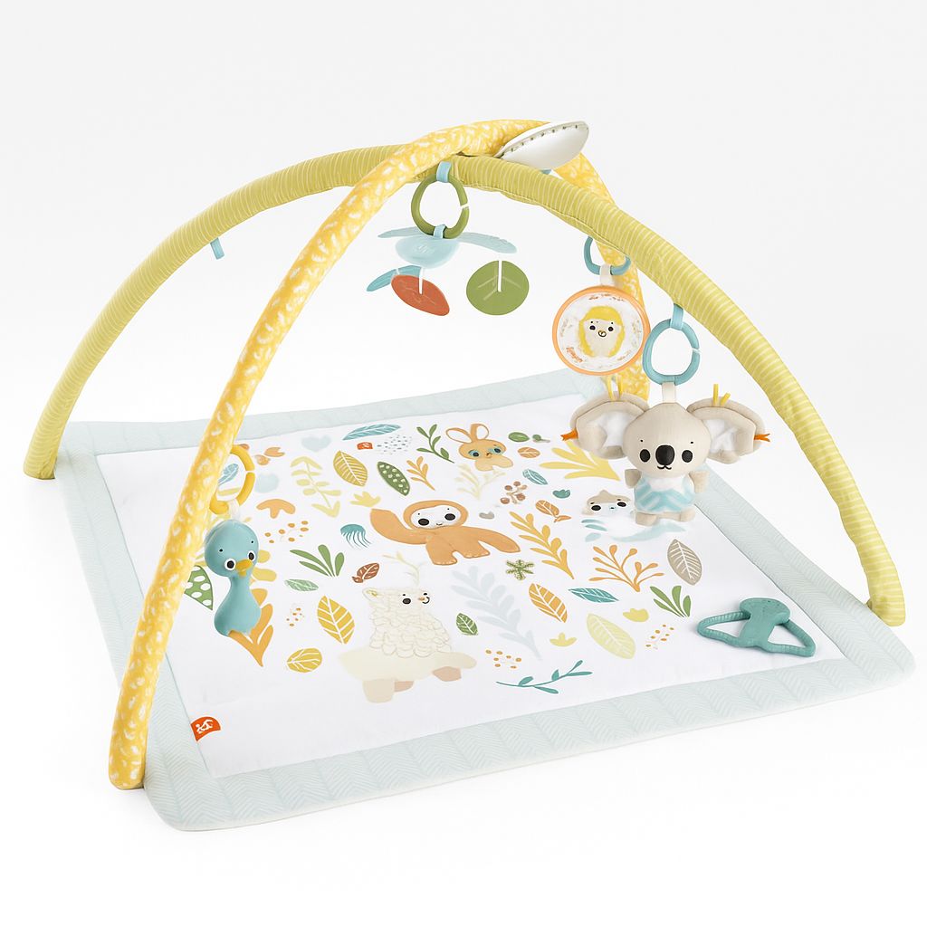 Conçu pour accompagner les premiers mois de développement, il propose 6 jouets sensoriels amovibles dont une peluche douce et un anneau de dentition sans BPA.